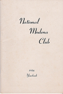 NATIONAL MODENA CLUB 1956 Yearbook, soft cover, 74 pages with two magnificent Eric Buri prints, one inside each cover, 7.75 by 5.25 inches, condition is very good/excellent - this is a very nice item...........................................................$20.00