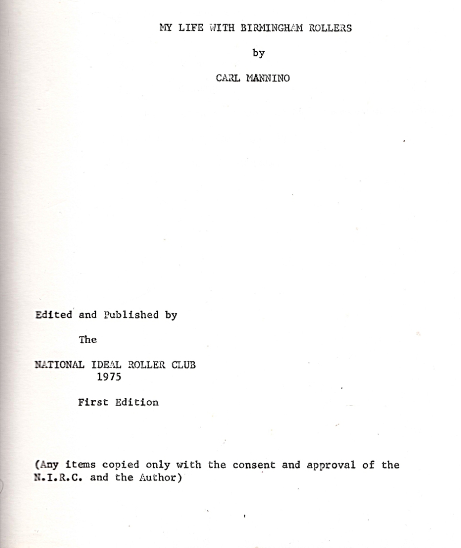 MY LIFE WITH BIRMINGHAM ROLLERS by Carl Mannino, 1975 First Edition, soft cover, spiral bound, low-tech published, 72 pages, 11.25 by 9 inches, some minor faults, good condition..$35.00